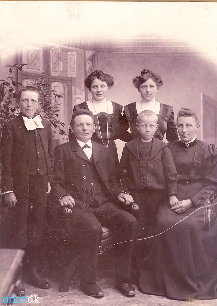 Beskrivelse | Familien på Kildegården i Skuldelev,siddende Anders Peter Jensen og Karen Margrethe født Nielsen.