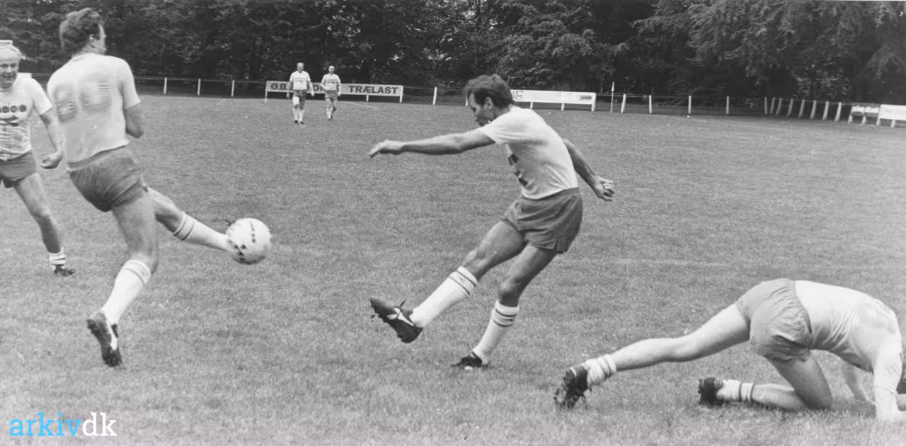 Bokseren Jørgen Hansen skyder mod mål. Til venstre ses Harald Nielsen, der var OL-topscorer ved OL i Rom i 1960.