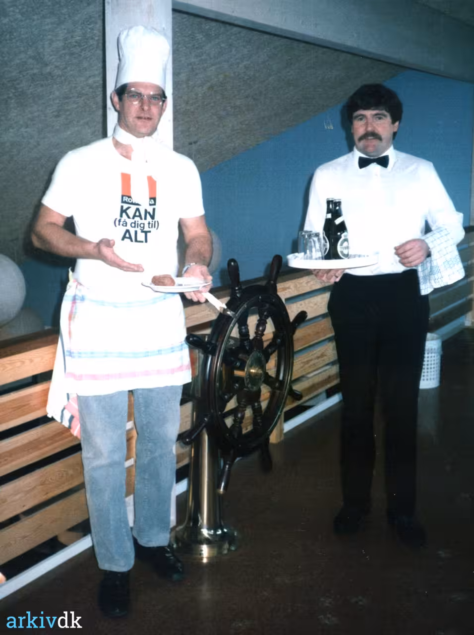Til venstre Mogens Pilegaard, der stod for det gastronomiske og til højre Peter Simonsen, der stod for serveringen. I starten var køkkenet i klubhuset betjent med frivillige medlemmer, der påtog sig en lørdagsvagt. Senere påtog udvalgene sig opgaven med at drive køkkenet. |
