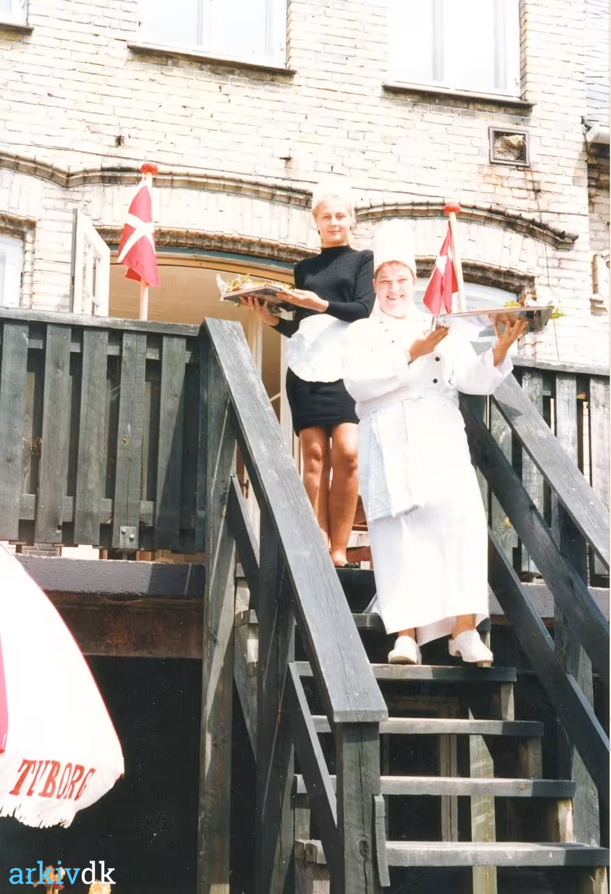 | Beskrivelse | Kokken og servitricen på vej ned fra terrassen på Karlebo Daghøjskole, Byvejen 14. Kokken er Charlotte Arnboe, der er opvokset i Nivå. Billedet er taget fra syd 1992. |