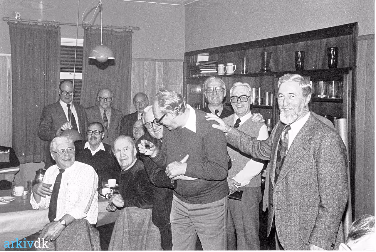 Stående fra venstre: Bøje Hansen, Aage Nørgård, K.O. Petersen, Kristian Møbius og Henning Ditlevsen. Siddende fra venstre: N.E. Rasmussen, H.C. Toft, C. Larsen, E. Ricks, og E. Oxbøl. |