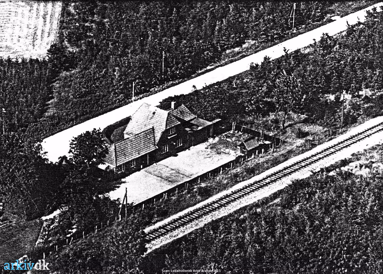 Bemærkning | bagside dato angivelsen er rettet - det nuværende er 1920, men det er næppe tilfældet da der ikke er adgang mellem station og skinnerne. Det er måske fra omkring 1971, hvor banen blev nedlagt og skinnerne endnu ikke var optaget. |