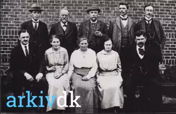 Vestergaard, Svendsen, Skoleinsp. Refer, Frederiksen, Rudolf Krichau Siddende fra venstre: Nygaard, Frk. Holm, Frk. Nørly, Fru Madsen f. Lund, Aussig Weiss. |