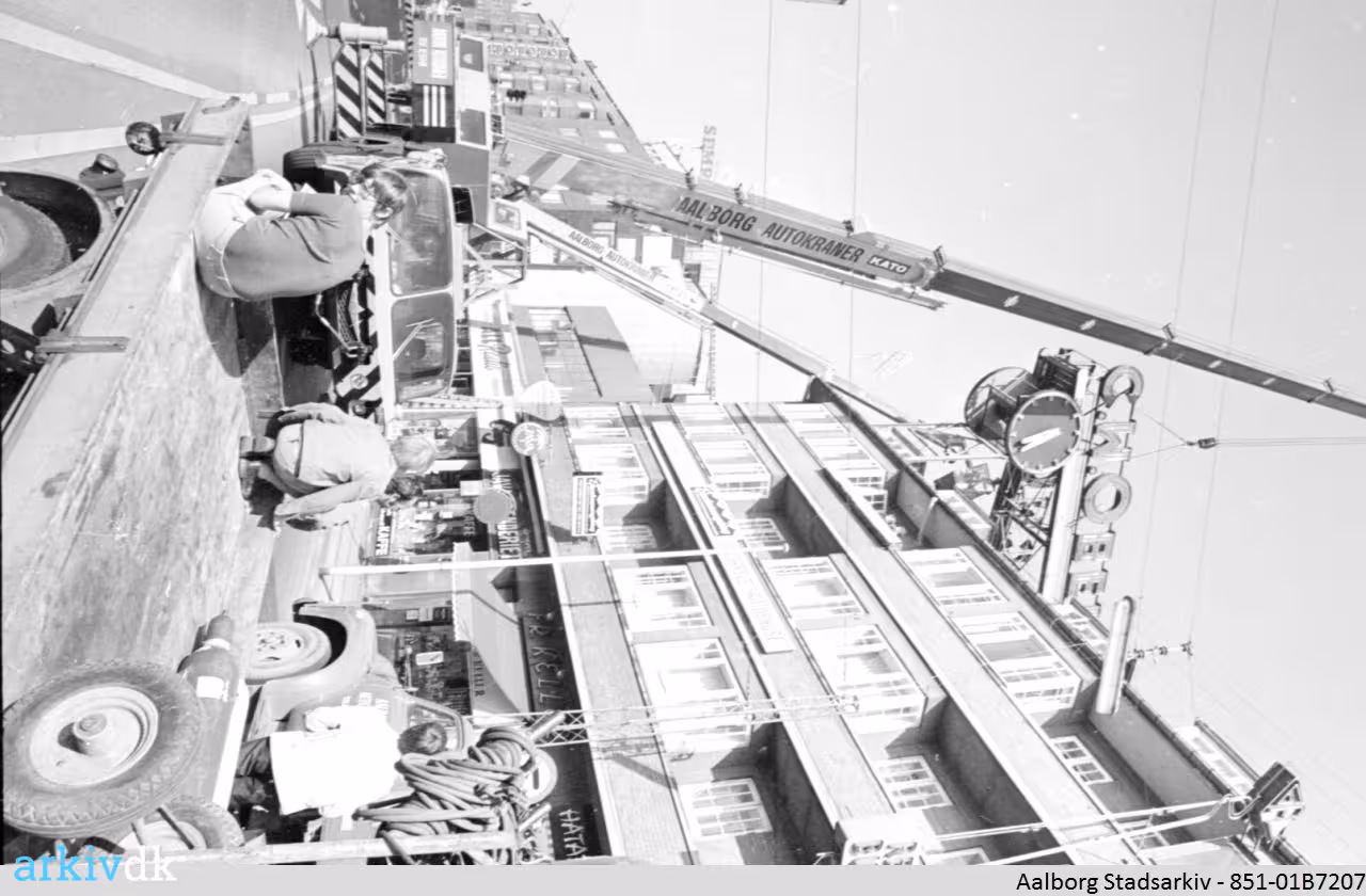 Beskrivelse | C.W. Obels ur demonteret og under nedhejsning fra taget på Vesterbro 50. Mobilkraner fra Aalborg Autokraner i funktion. |