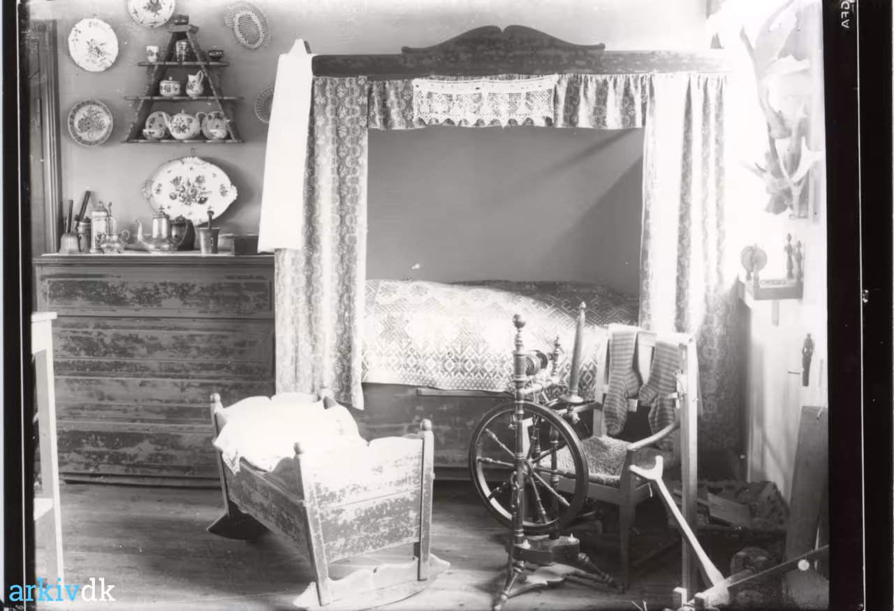 | Beskrivelse | Antagelig Høve Museum. Bondestuen med alkove, spinderok og vugge |
