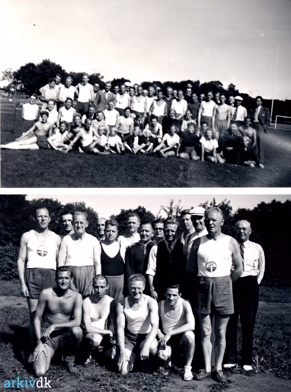Aalborg Stadion. Øverst og i bageste række til højre Julius Nielsen (med lys kasket) og helt foran Helmer Broberg. Nederst og i forreste række fra venstre Karl J. Hansen, Poul Henning Pedersen, E. Nielsson og Herluf Hansen. I bageste række: Valdemar Jensen, Heinrich Hansen, Aage Christensen, Bruno Ditzel, William Simonsen, Tscherning Mortensen, W. Danneman, ?, ?, Gunnar Larsen Kjeldsen, Joachim Giehm, Aage Jakobsen og Julius Nielsen. Gunnar Larsen Kjeldsen er født den 29. juni 1913. Død den 19. juni 1954. |