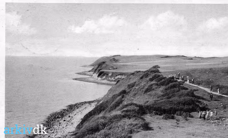 | Beskrivelse | Billedet er taget fra en bakketop, så man ser vestkysten på Nexelø. Der er en masse mennesker ude at gå tur i området. |