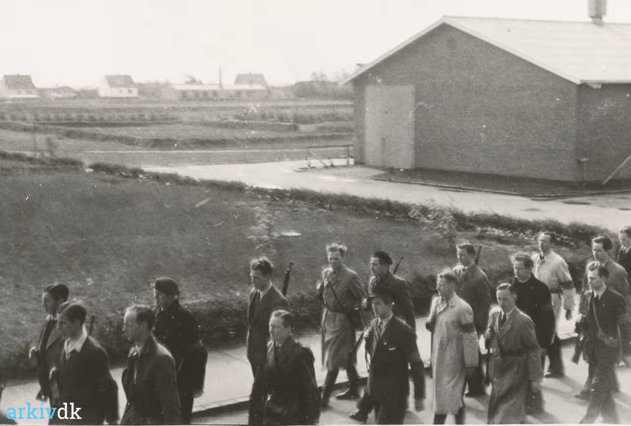 Beskrivelse Hjørring, Frihedskæmpere ved befrielsen, gruppe marcherer.