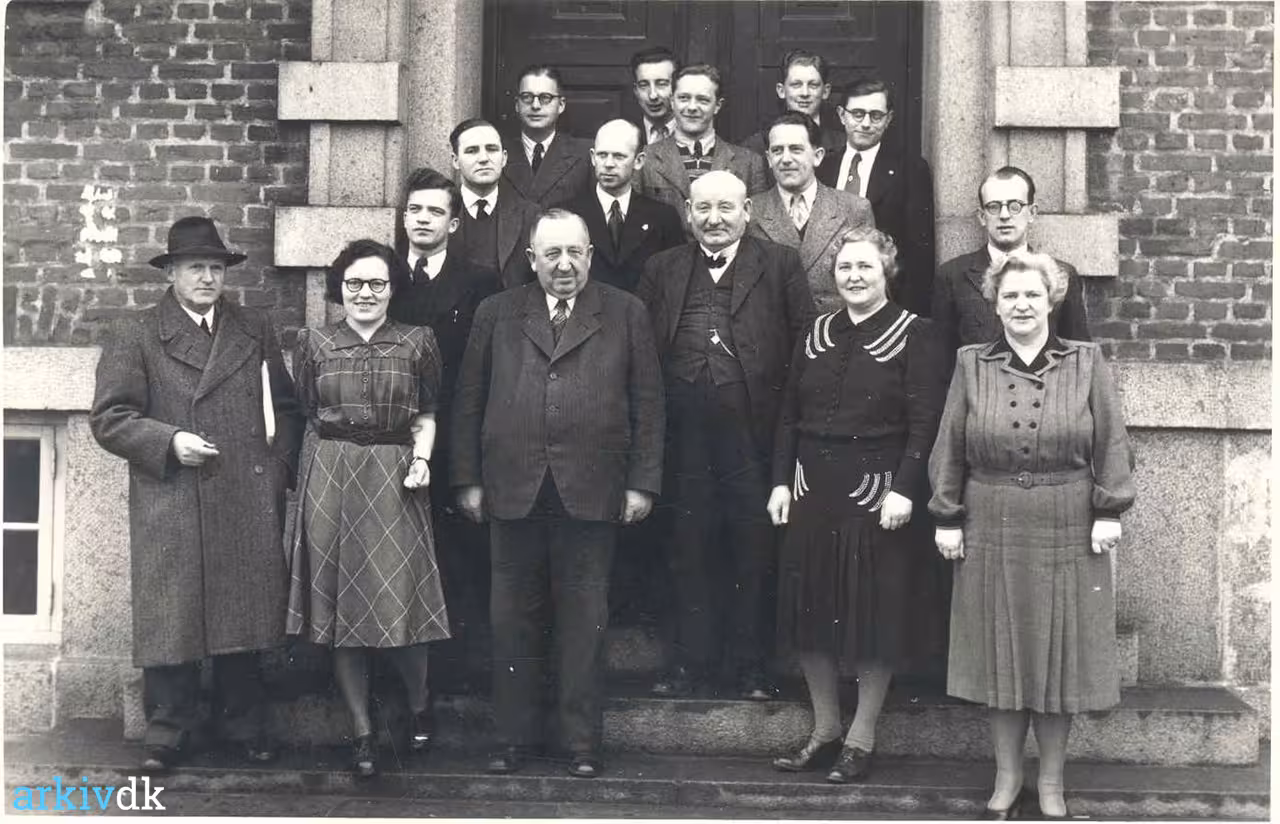 3. række fra venstre: Pantefoged Svend Aage Hemmingsen, Fuldmægtig Knud Tveden, Carl Erik Pedersen, Erik Larsen og Lars Peter Petersen blev senere Socialinspektør.