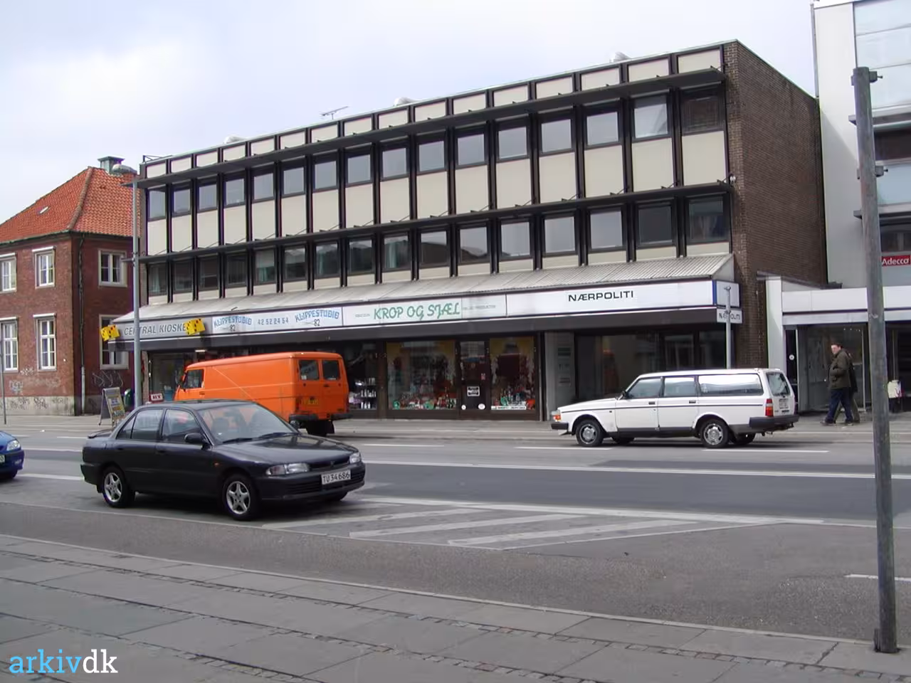 Beskrivelse Centralkiosken, Klippestudio 82, Krop & Sjæl helsekost og Nærpolitiet, Køgevej 82. Tv. ses Rådhuset, th. Køgevej 80.