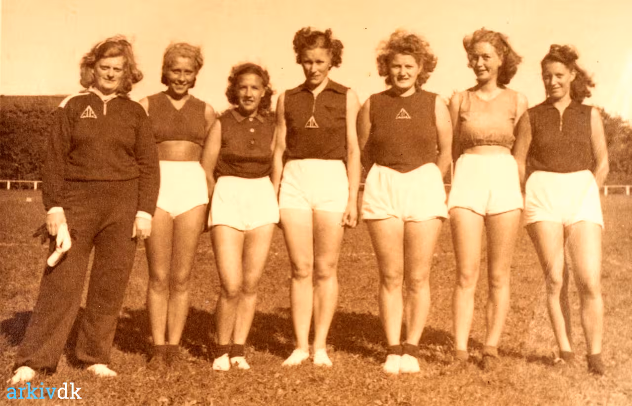Håndbold. Vejgaard Stadion. Fra venstre: Betty Christensen, Grethe Jensen, Hilda Christensen, Herdis Christensen, Lis Tolbod, Karen Jensen og Gudrun Christiansen. |