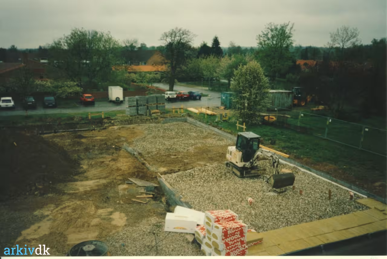 Beskrivelse ff Kirkehavegårds genopbygning efter brand i 1997 set mod Sognegården