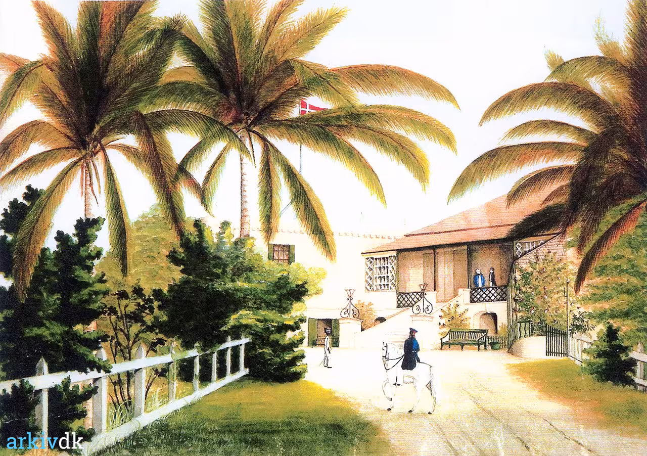 Beskrivelse | Akvarel af landstedet Bülowsminde på St. Croix, en såkaldt gouache, fra 1830'erne, malet af Frederik von Scholten (bror til Peter von Scholten, som er herren i den blå jakke på verandaen).