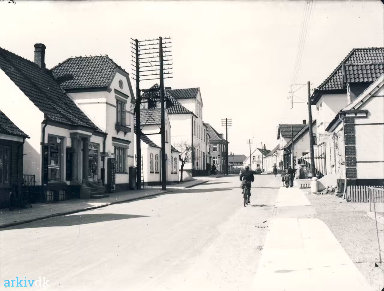 Til venstre ses købmand Vagn Radmers forretning efterfulgt af tlf.-centralen. På modsatte side ses damefrisør Frederiksens salon, købmand Laurits Nielsens forretning og Anker Jensens installationsforretning. Bagest i midten skimtes maler Ingemanns gavl. |