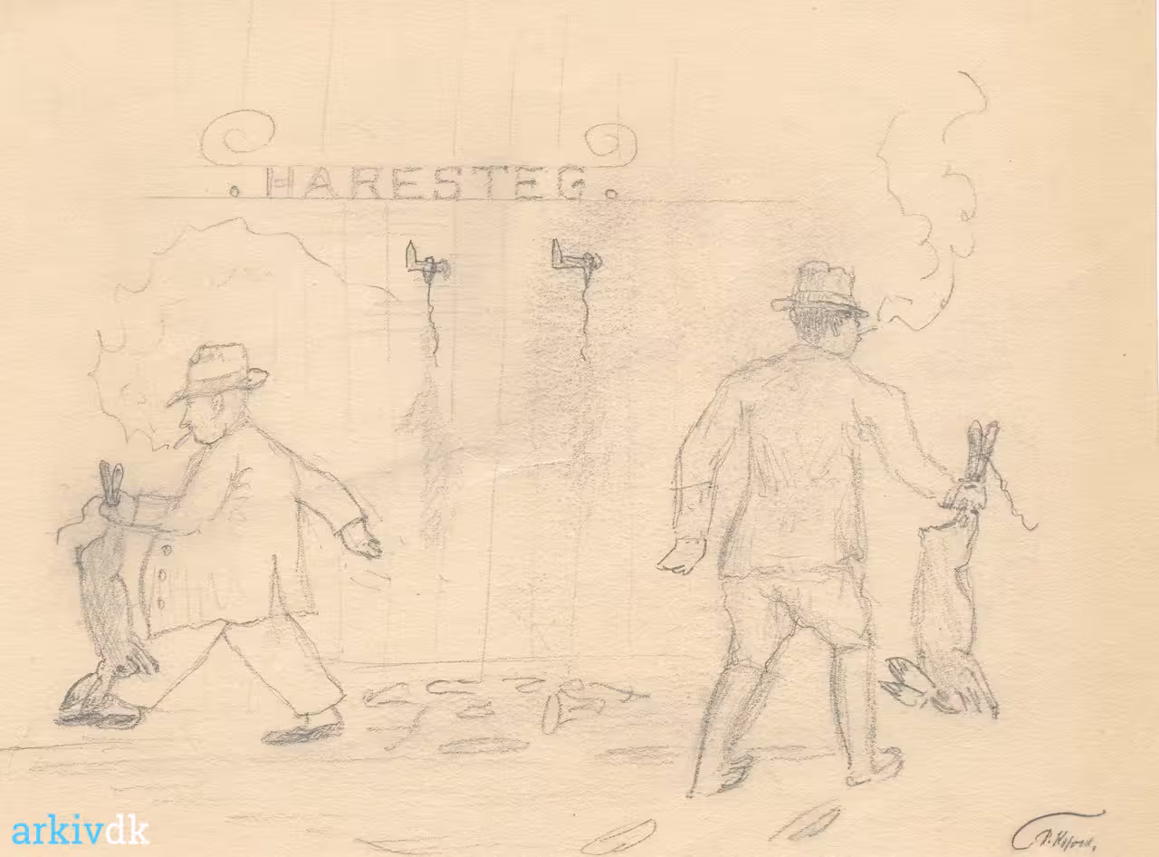 | Beskrivelse | Ved en klapjagt på Odden blev det bestemt, at de tilstedeværende jægere skulle mødes på Hotel Phønix og spise haresteg sammen, og to harer blev hængt til side for dette formål.