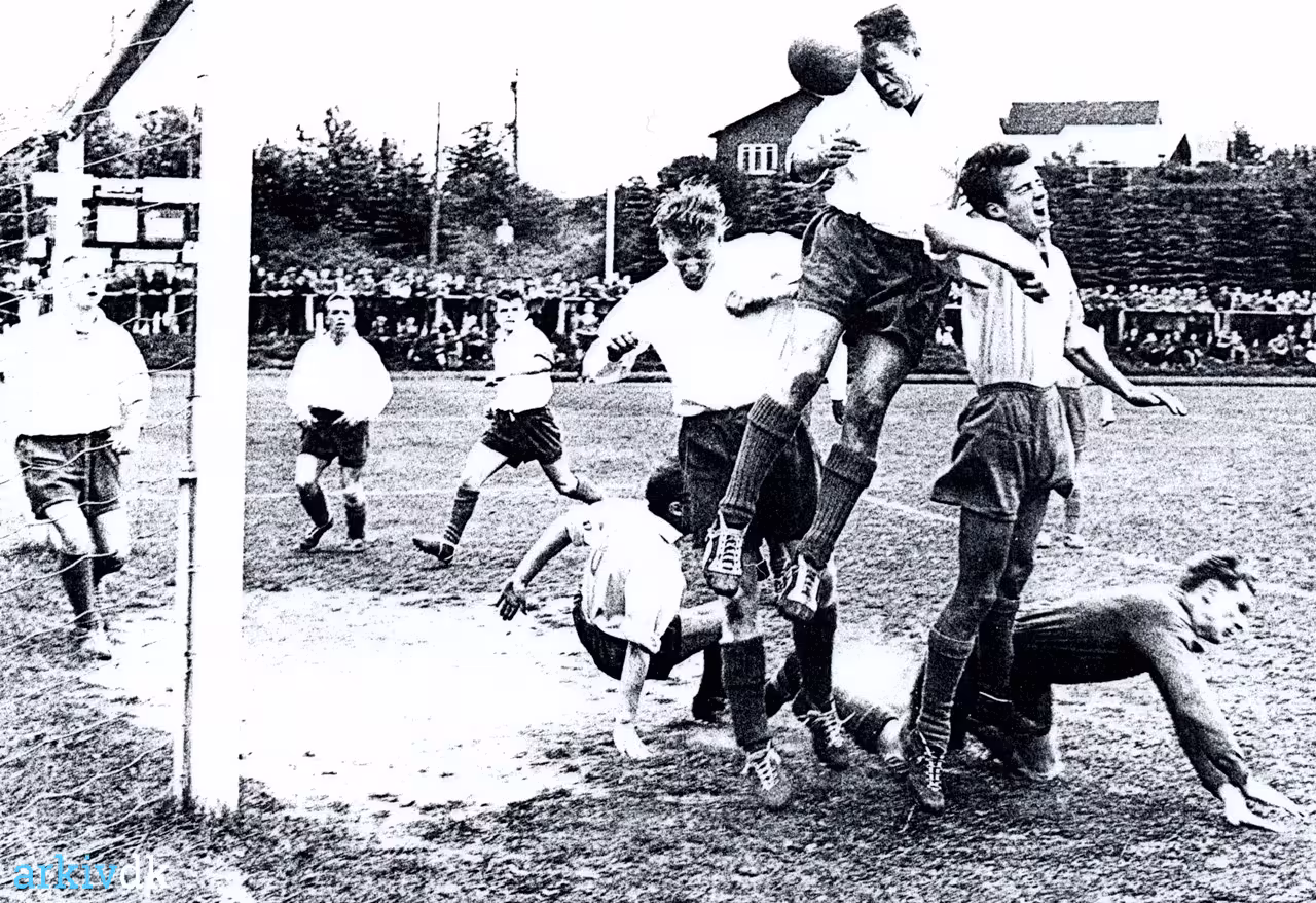 Klubbens førstehold forsvarer sig med målmanden Bent Kubicki liggende foran det øvrige forsvar. Mellem stængerne Jørn Giehm, dernæst i baggrunden Karl Christian Kjeldsten, Tage Kofoed, siddende på halen Jørgen Schultz, dernæst Jørn "Saimon" Andersen, og Anthon Ottesen, der header til hjørnespark.