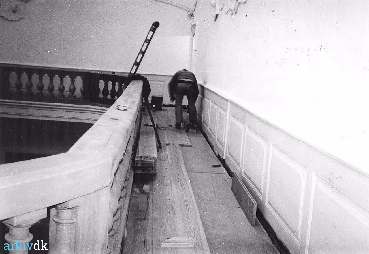 | Beskrivelse | Fredensborg Slot, Renovering, 1978. En håndværker i arbejde. Der lægges nyt gulv på balkonen evt. Kuppelsalen. |