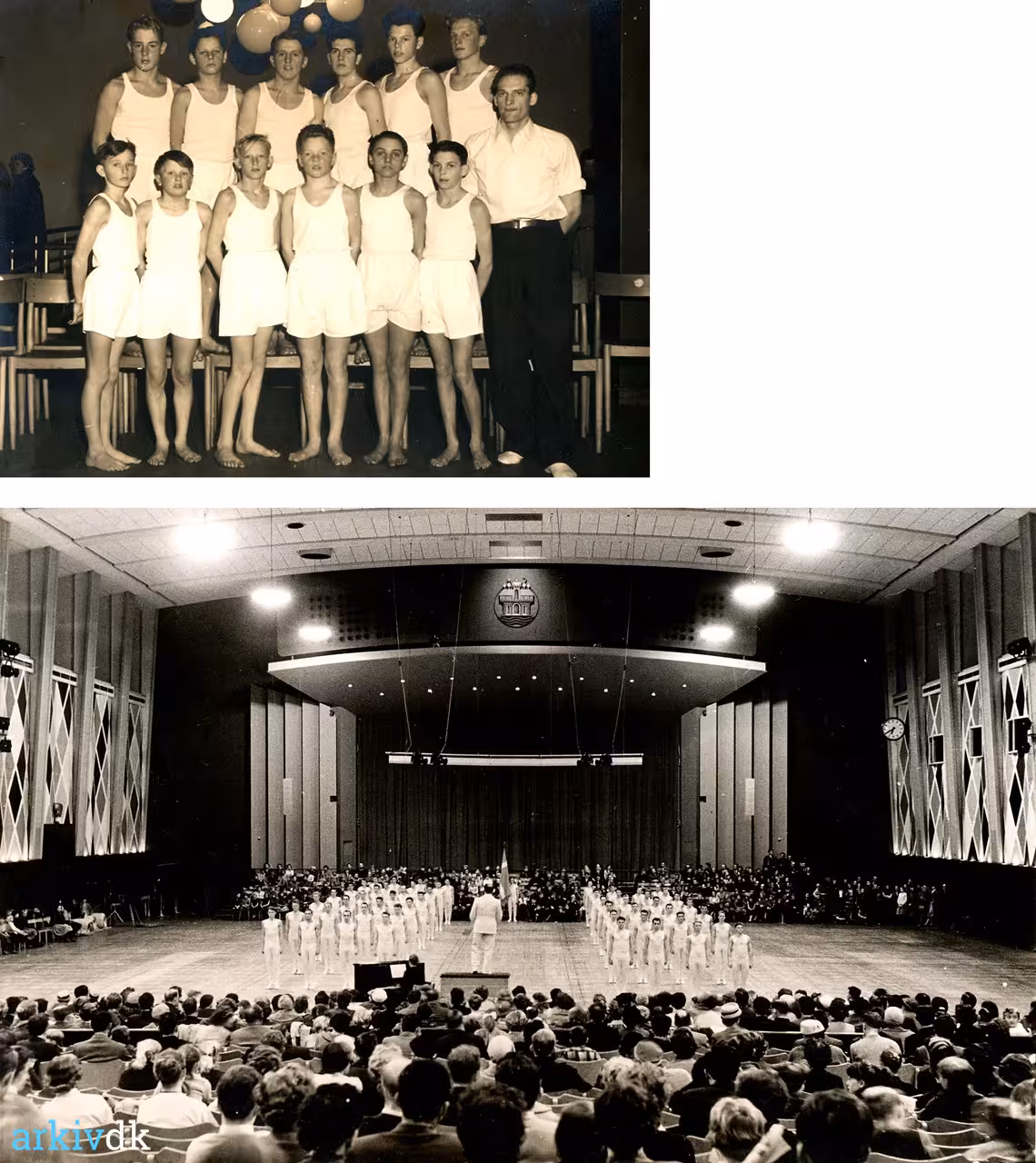 Aalborg Amts Gymnastik- og Idrætsforeninger (AAGI). Fotoalbum. Gymnastikstævner i Aalborghallen den 4. marts 1956 og 2. marts 1958. Billeder. Øverst: Nøvling Idrætsforening i 1956. Nederst: Opvisning i 1958. |
