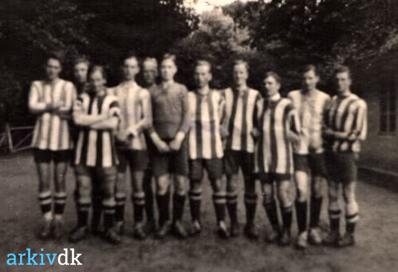 Fra venstre: Gunnar Jacobsen, Holger Sørensen, Carl Vilhelm Christensen, Arnold Jensen, Dalhoff Jørgensen, Hother Kjærulff, Oskar Nielsen, Aage Winther Nielsen, Aage Geert Jensen, Svend Nielsen og Peter Sørensen. Aage Vilhelm Geert Jensen er født den 16. januar 1895. Død 12. januar 1963. Dalhoff Jørgensen er født den 17. januar 1904. Død den 25. januar 1968. Aage Winther Nielsen er født den 26. maj 1899. Død den 26. august 1988. |