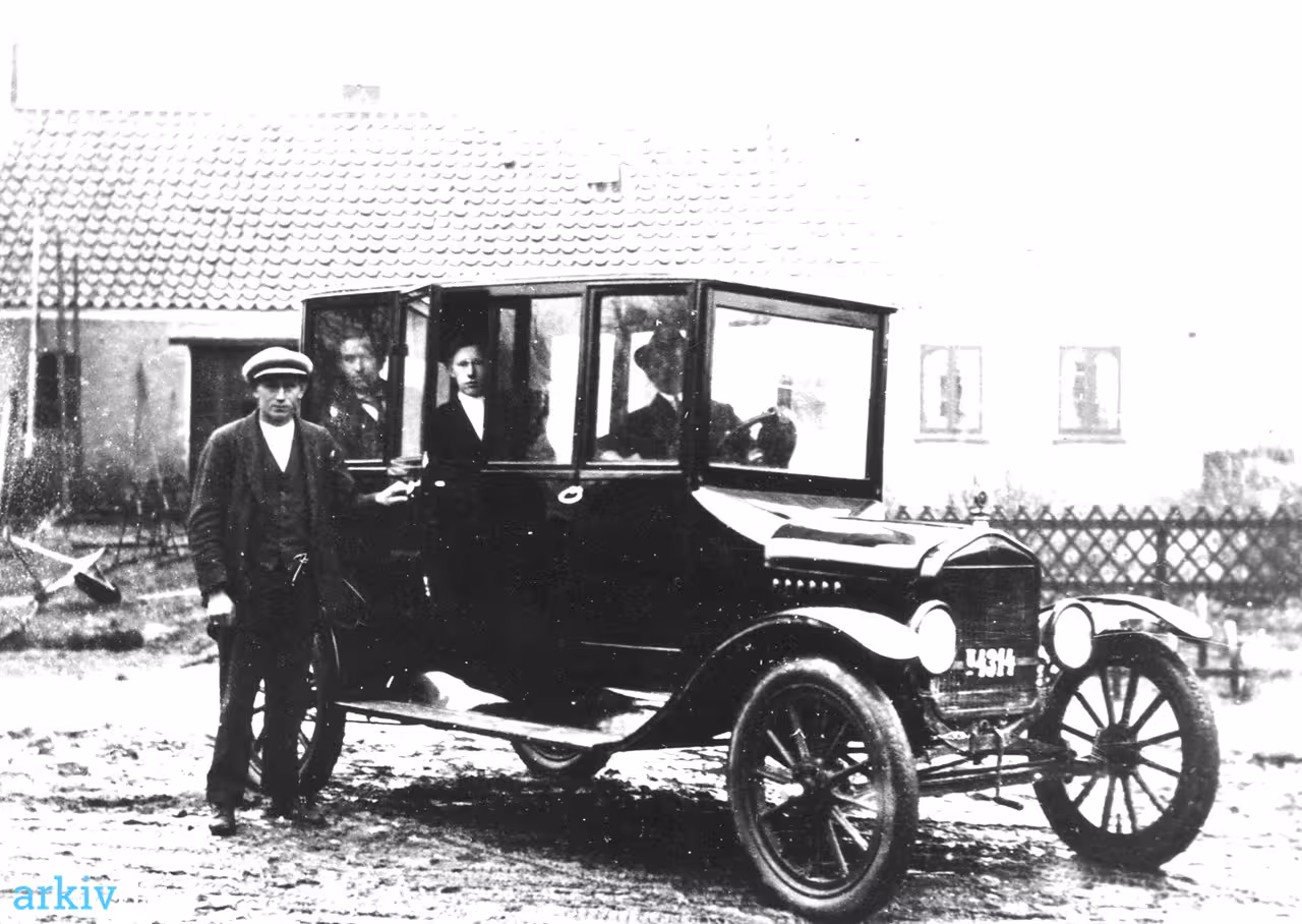 Beskrivelse Taxa, Lange Maren, Øster Hornum, foran smedjen. Vognmand Chr. Jacobsen, bagest Georg Svenningsen, Karl Haase Øster Hornumvej 9530 Støvring