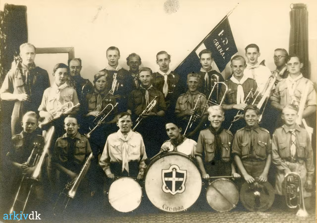 | Beskrivelse | På billedet her, der er taget i 1942, sidder Arne Bilde Olesen i forreste række med bækkenerne. En anden FDF’er, som har været aktiv musiker, indtil for nogle få år siden, sammen med Arne, er Herluf Sørensen, der står i bageste række med fanen ”stikkende” ud af sin venstre skulder. Begge har nu sluttet deres musiske liv efter mange år sammen i Grenaa Blæserne. Udover Arne og Herluf er der flere på billedet, der stadig bor i Grenaa.