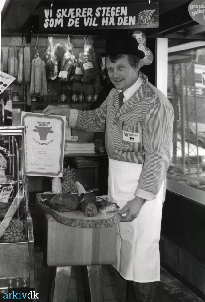 | Beskrivelse | Fotoet af slagter Winther er taget i forbindelse med, at han har fået et diplom. Billedet er en del af en større fotosamling, som Hirtshals Kommune i sin tid modtog fra Hirtshals Avis. |