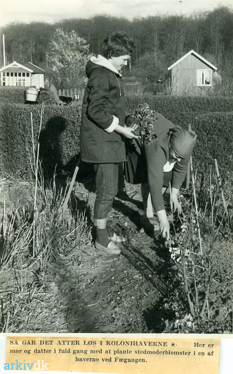 4 Billede af Erna Christensen og datteren Elisabeth, som planter stedmoderblomster i en af haverne ved Fægangen 1961. Erna Christensen havde Sorø Kiosk, Storgade 20. Foto taget i anledning af , at hun fik en havepris. Pressefotograf 16x11