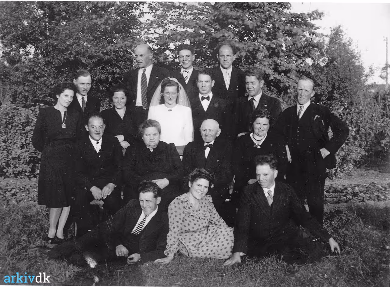 Familien er samlet i anledning af Henny og Harald Cramers bryllup. Midt i billedet står brudeparret. Foran dem sidder brudgommens forældre, Jakob (1872-1948) og Jacobine Margrethe Cramer f. Petersen (1879-1969), og deres 10 børn er alle med på billedet. Jakob døde 30.6.1948, hvorefter sønnen, Peder Cramer, overtog fødegården i Benslehøj. Forreste rk. fra venstre: Niels Nielsen (vognmand), Ninna Nielsen (f. Cramer), Peder Cramer 2 rk. fra venstre: Frederik Magnus Cramer, Margrethe Cramer, Jakob Cramer, Eleonora Kathinka Schnoor (f. Cramer) 3 rk. fra venstre: Meta Signe Jensen, Christian Christensen, Ingrid Jensen (f. Cramer), Bruden Henny Cramer, brudgom Harald Cramer, Carl Ammitsbøll Jensen, Aksel Schnoor (døde få år efter). Bagerste rk. fra venstre: Emanuel Cramer (1909-1998), Ove Cramer (1923-2009), Johan Alfred Cramer Billedet findes i kopi |