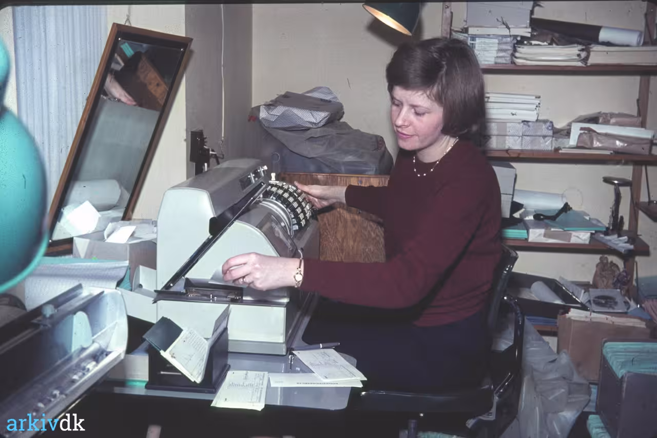 | Beskrivelse | Kvindelig bankassistent ved en form for skrivemaskine / hulkortmaskine i Lemvig Folkebank. Bag maskinen er der et spejl. Rummet ligner et pulterkammer eller et lagerrum. Der er en reol med papir og andet i baggrunden. |
