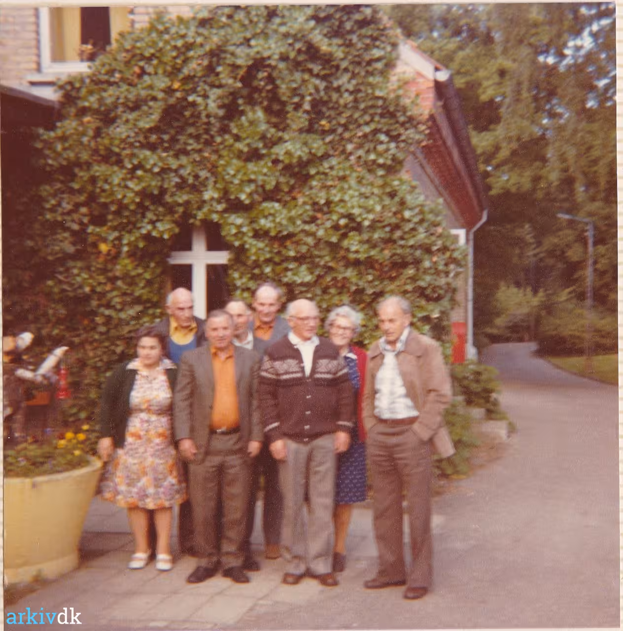 Fotograferet i Østskoven ved Hobro: Bagerst fra venstre: Harry, Tage (skjult), Peter og Agnete. Forrest: Agnes, Arne, Villy, og Alfred. |