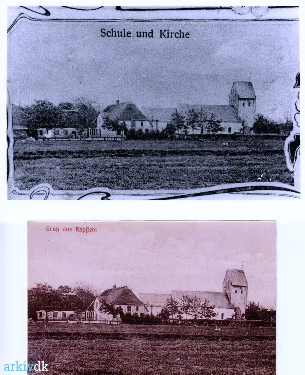 Beskrivelse Postkort med Ravsted kirke og Ravsted skole.