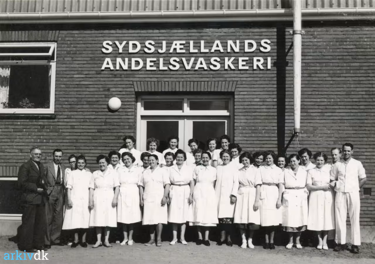 Personale foran indgangen til Sydsjællands Andelsvaskeri,