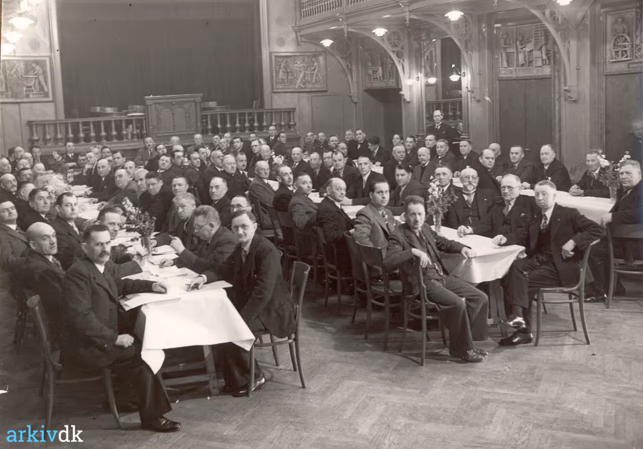 Glostrup og Omegns Fællesbageri Røde Vejrmølle. Generalforsamling i Folkets Hus i Rømersgade i København. Ved midterbordet bestyrelsen. Med hvidt fipskæg og briller smedemester Chr. Larsen, til højre for ham formentlig overportør Niels Nielsen og dernæst direktør Carl Jensen. Over for Niels Nielsen formentlig formand Peter Knudsen (sognerådsformand i Taastrup).