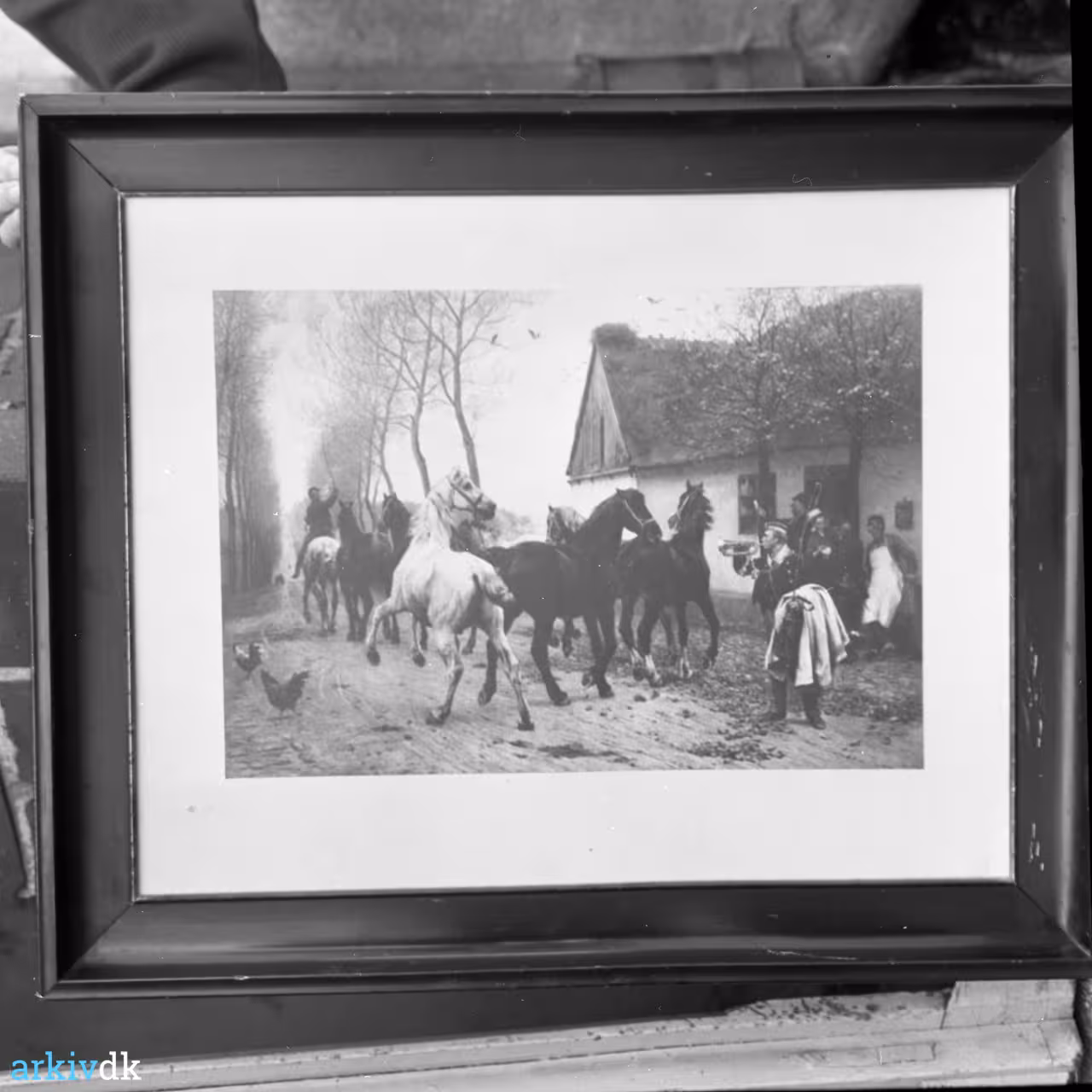 | Beskrivelse | Reproduktion af Otto Bache (1839-1927) med motivet: "Et kobbel Heste udenfor Lindenborg Kro" fra 1878. |
