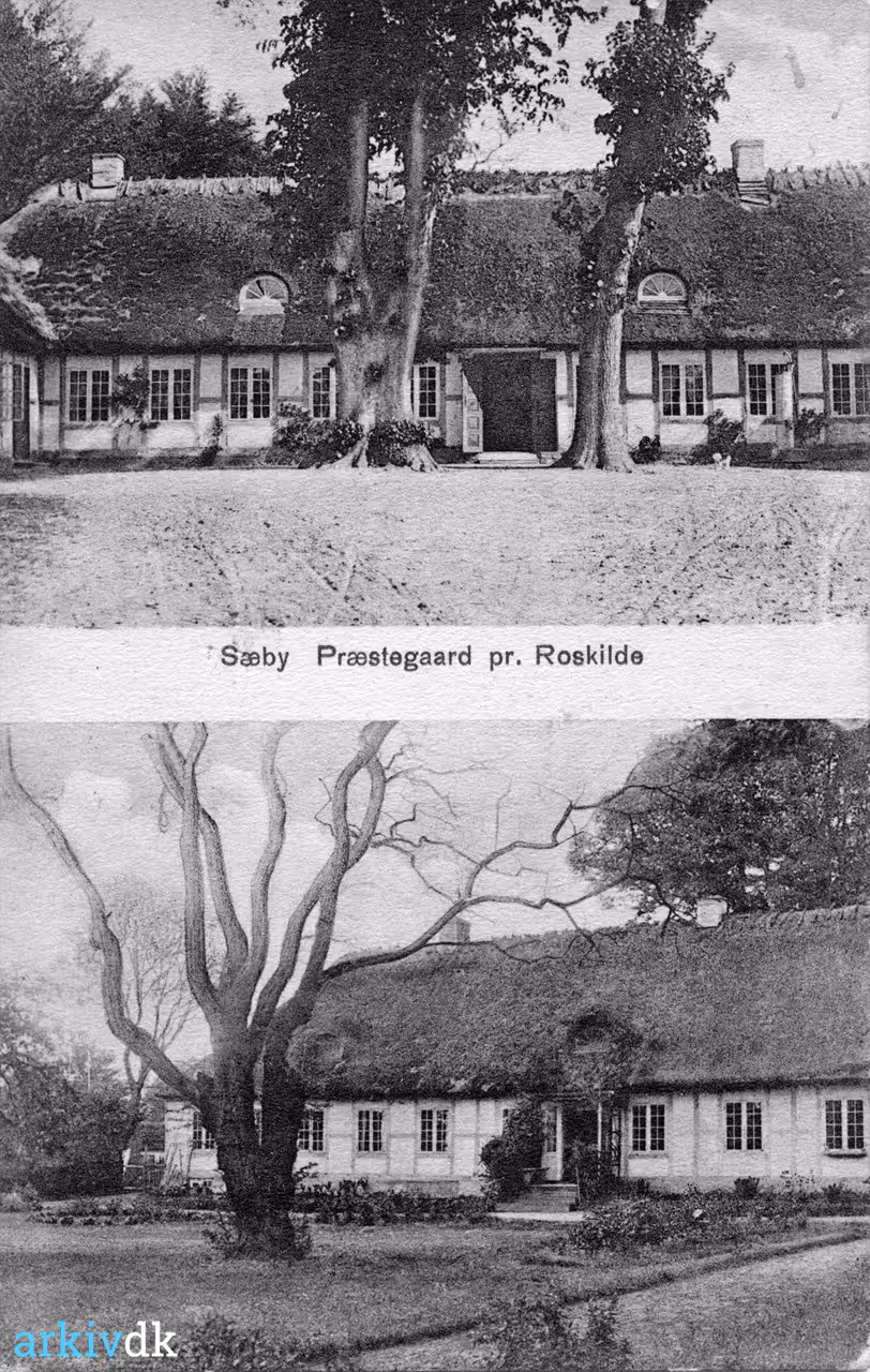 Beskrivelse Postkort med Sæby præstegårds gårdsplads og have