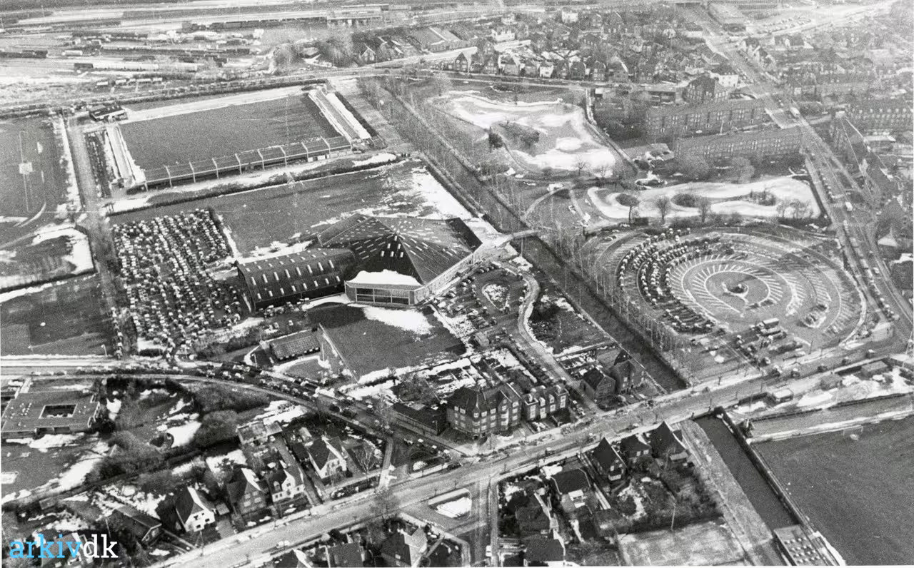 Nykøbing F. Luftfoto i sort / hvid, et vinterbillede med let sne på tage og veje og med Hallen i centrum. Man ser den store parkeringsplads " Cementen" til højre for hallen.