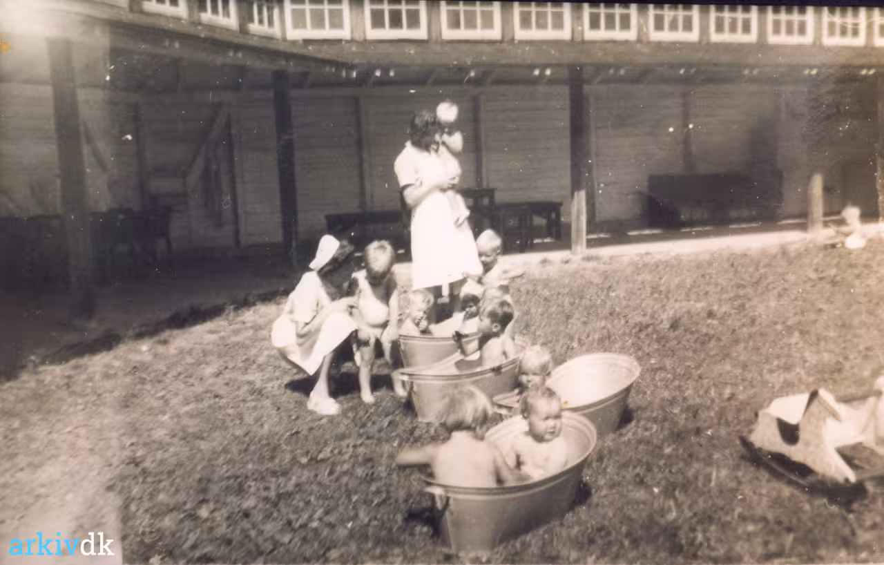 Beskrivelse Plaskedag i haven på Østruplund. Frk. Clausen står med et barn på armen. I baggrunden ses soveverandaen
