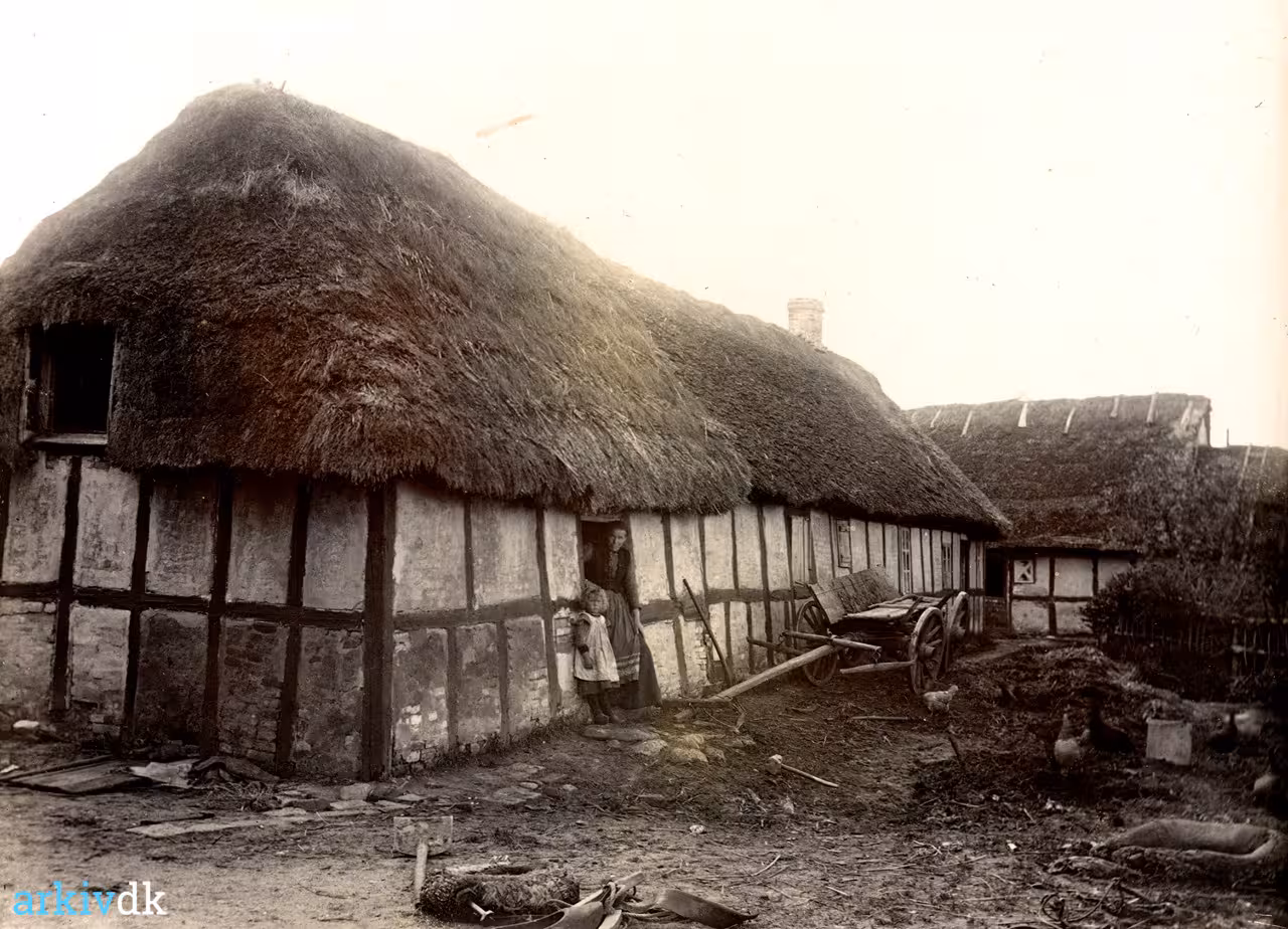 I døren ses Ane Kathrine Christensen (Trine Ernst) (1876-1953) gift med træskomand Niels Christensen og datteren Ane Marie Christensen (1902-). Langs muren ses en stivvogn. |
