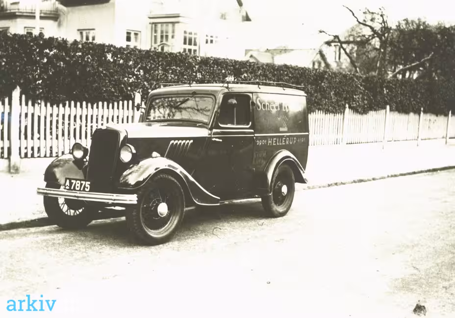 En varevogn fra isenkræmmer Scheel-Larsen holder ved kantstenen på en villavej