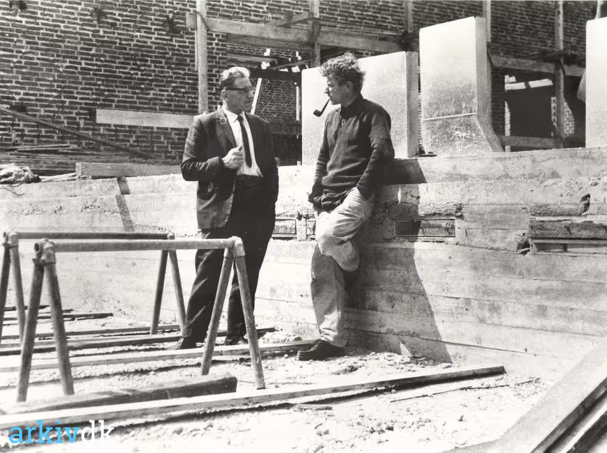 | Beskrivelse | Islev Kirke under opførelse, på billedet ses murermester A.D. Skjellerup og hans søn Poul Skjellerup.