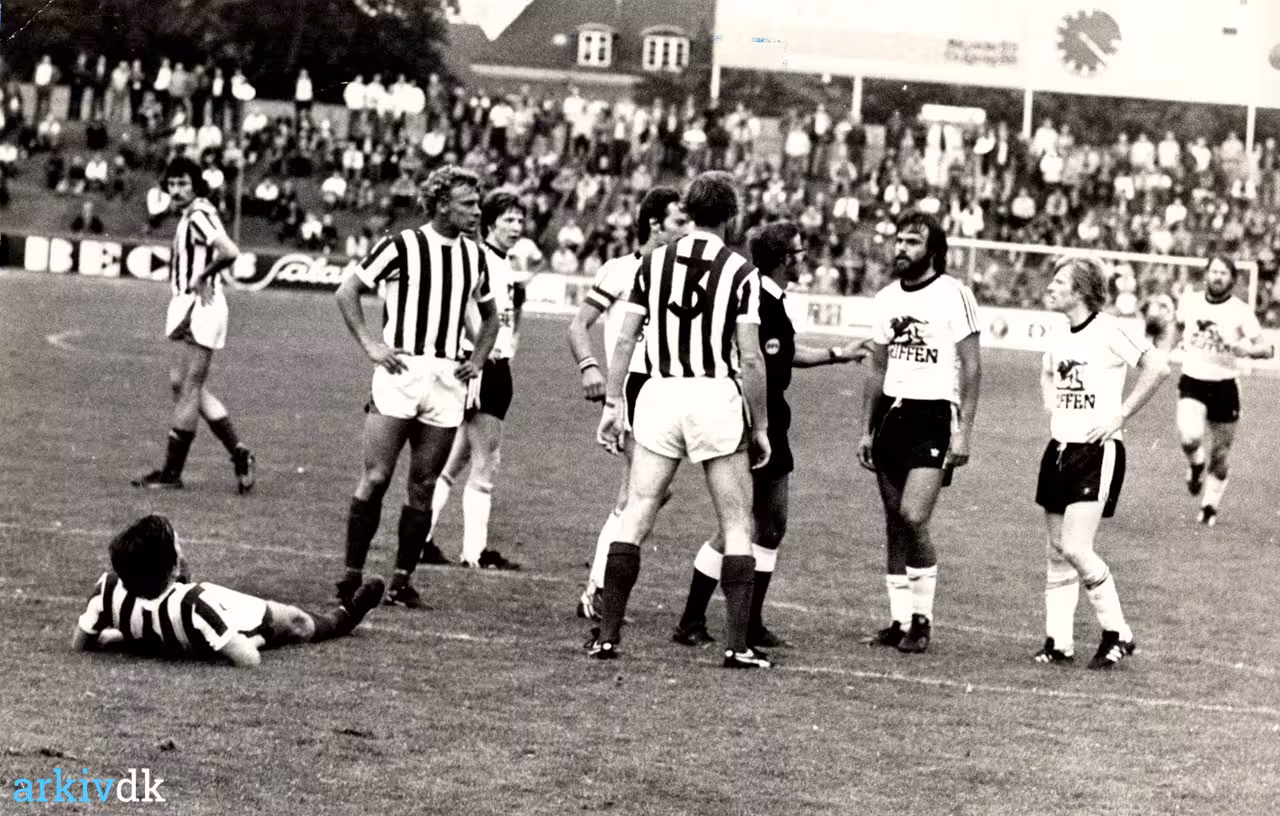 Dommer Niels Thorstensen taler bestemt til Vanløses Jacob Rosander. AaB'erne er fra venstre: Jens Erik Kristensen, John Andersen, Henning Munk Jensen med nummer 3 og liggende Erik Nielsen. AaB rykkede dette år ned i 2. division. |