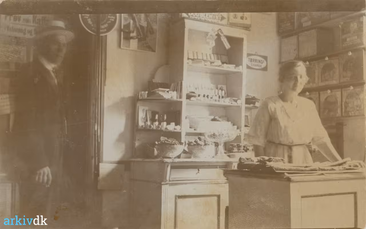 Beskrivelse | Foto fra bager og købmandsforretningen på Vissenbjerg kro. På billedet ses onkel Otto og moster Dagmar i butikken i bagerafdelingen |