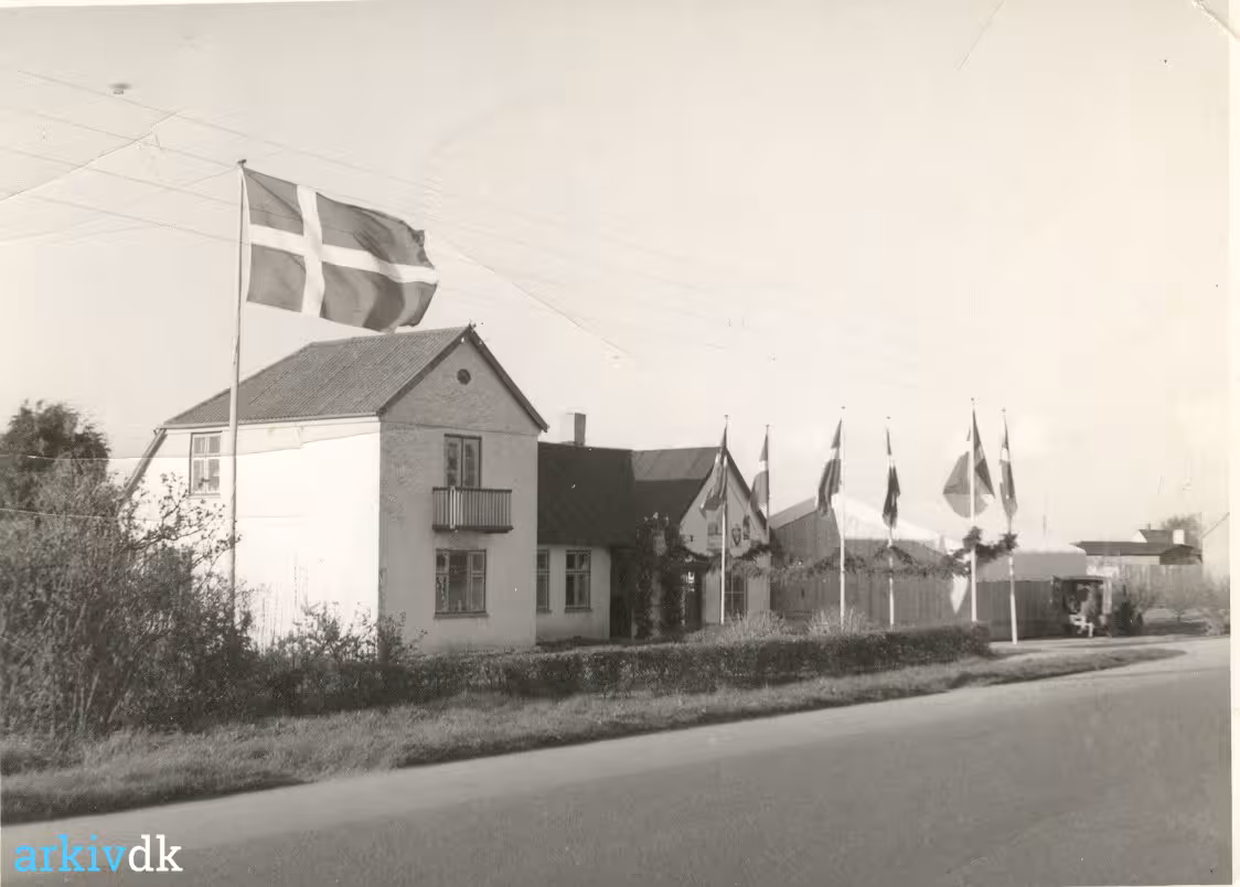 i slutningen af 1950´erne. Ejendommen er smykket med æresport og flag. |