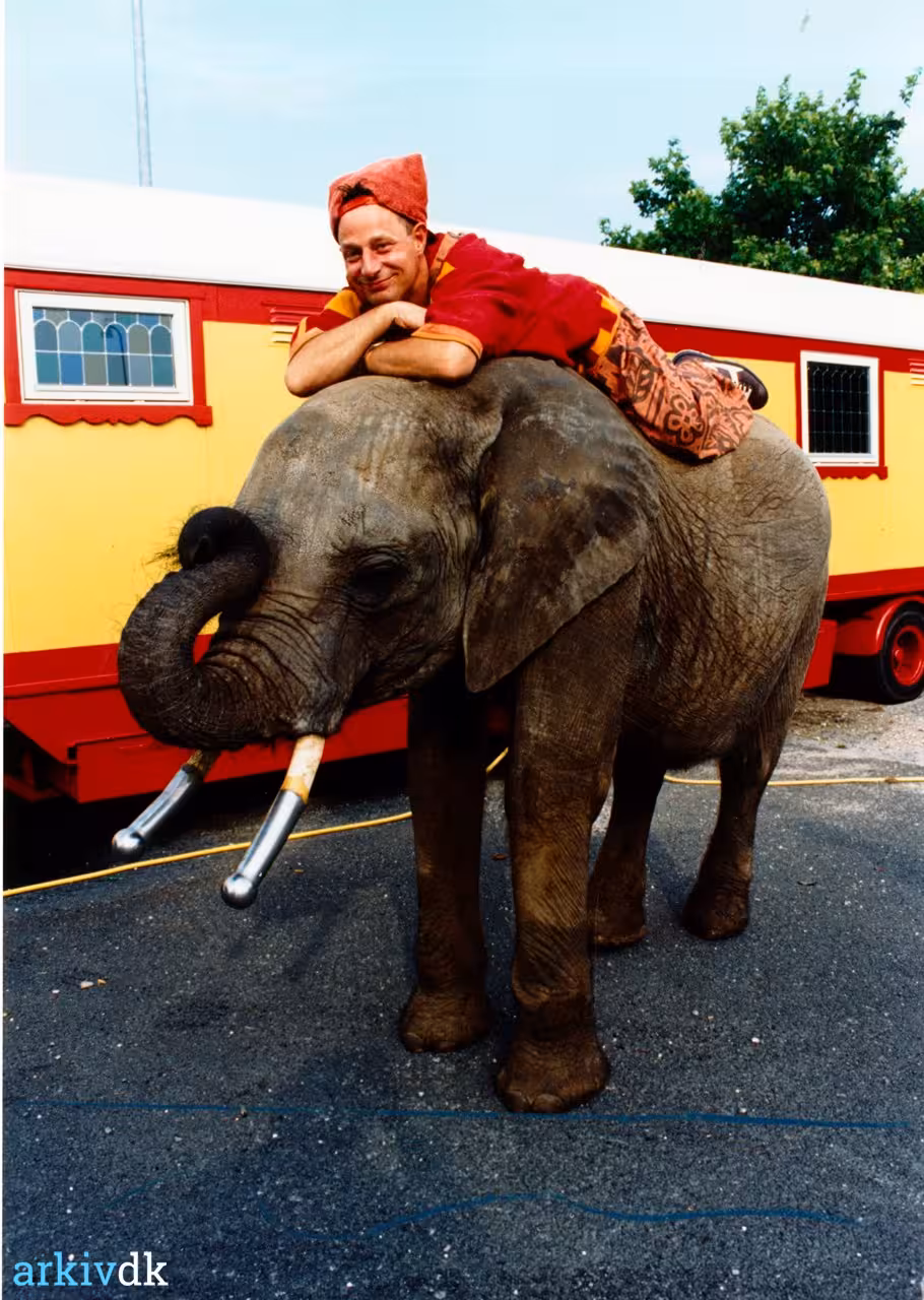 Pyrus (skuespiller Jan Linnebjerg) ligger på ryggen af Cirkus Arenas elefant