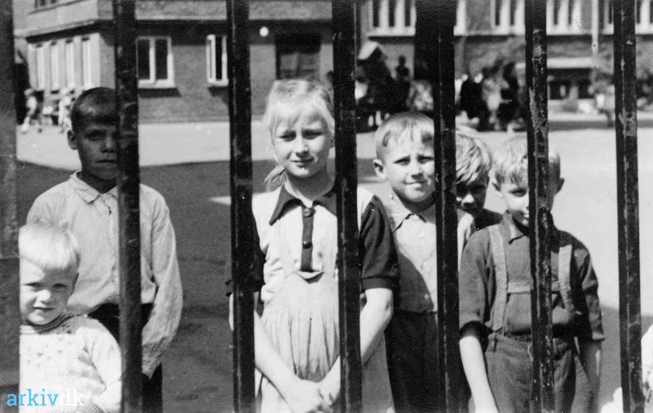 Beskrivelse Tyske flygtninge børn i skolegården på Jernbanegade Skole.