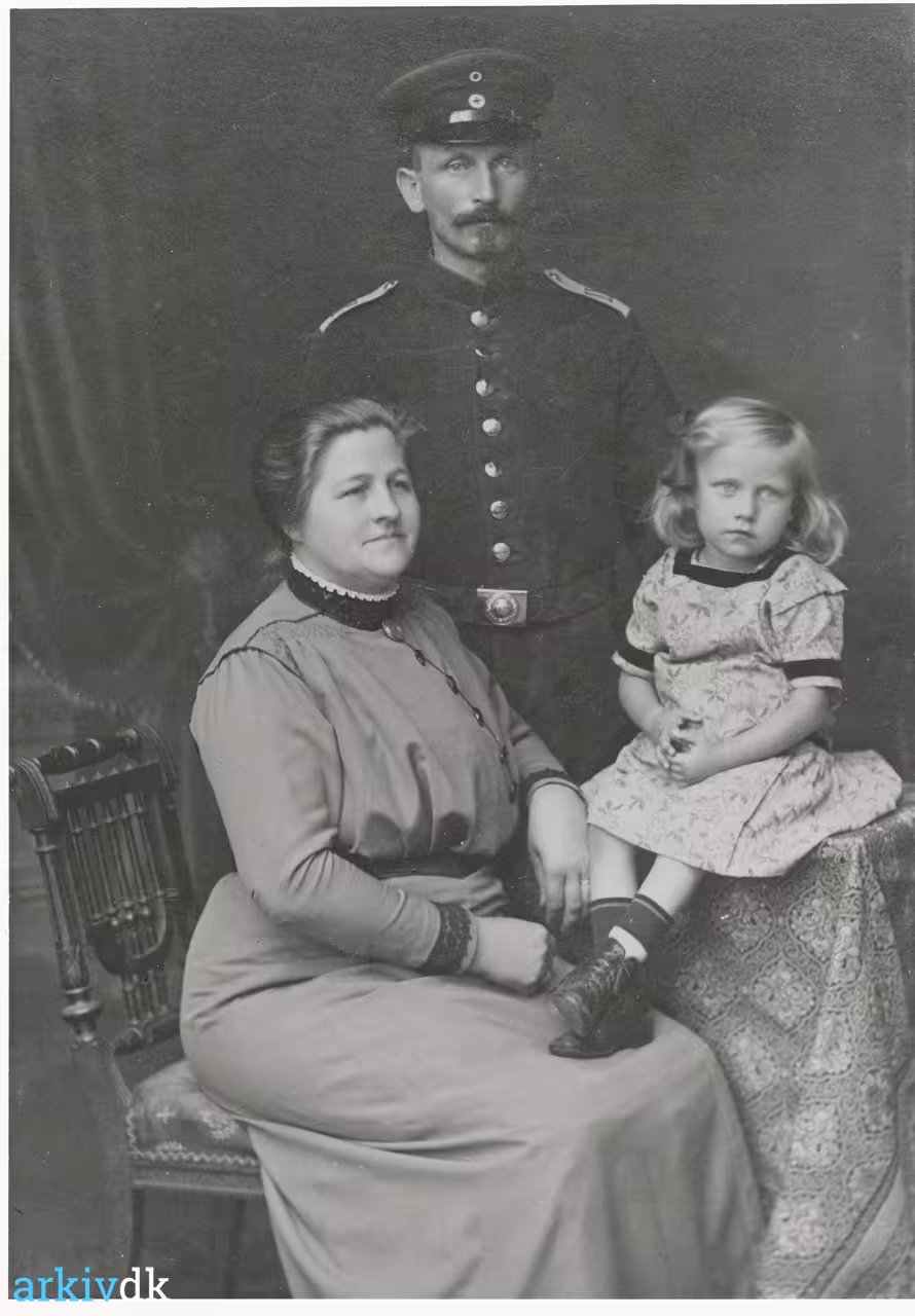 Beskrivelse Poul Poulsen, i uniform fra 1. verdenskrig, sammen med sin kone Frederikke og lille Sine