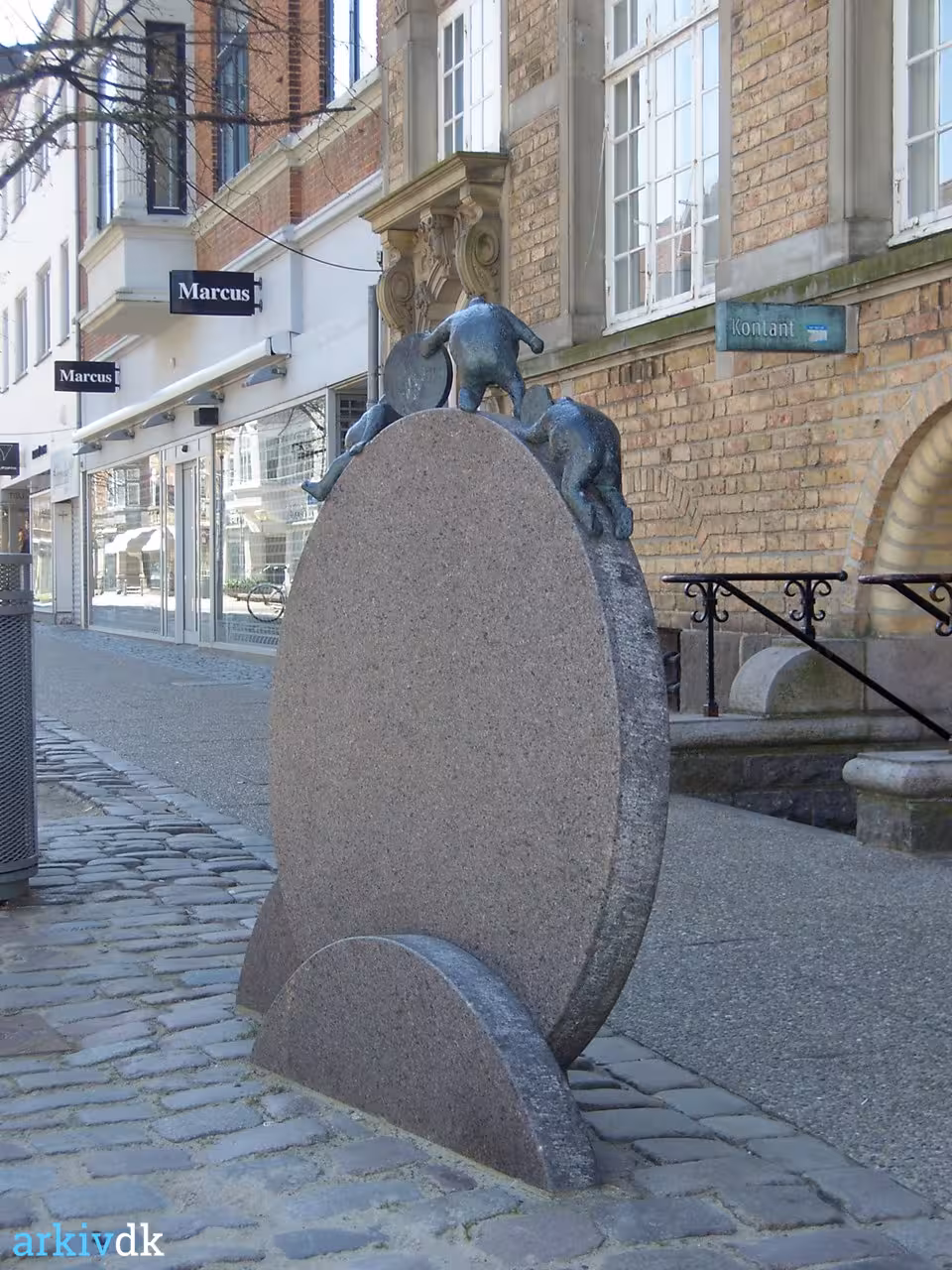 Små bitte mænd, der triller en stor mønt. Projektet synes umuligt, men i Keld Moseholms skulptur lykkes det. Den store runde skive er godt nok placeret solidt i jorden, men de små, tykke mænd lægger alle kræfterne i, og man ser for sig, hvordan mønten begynder at trille om lidt.