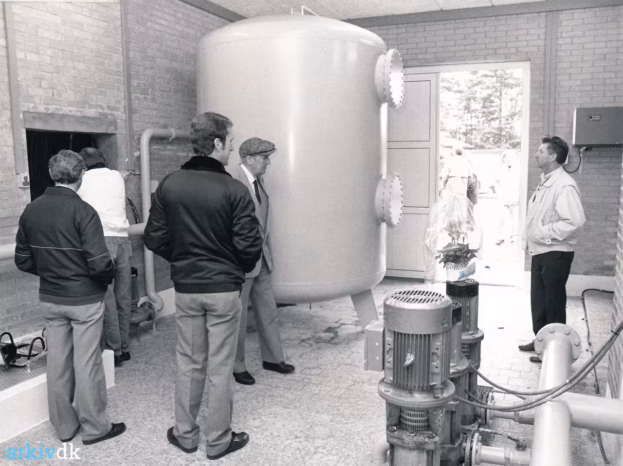 Kollund Vandværk Frederik Clausen med kasketten, Kollund Møbler Sven Nielsen med ryggen til og til højre Lorens Schmidt