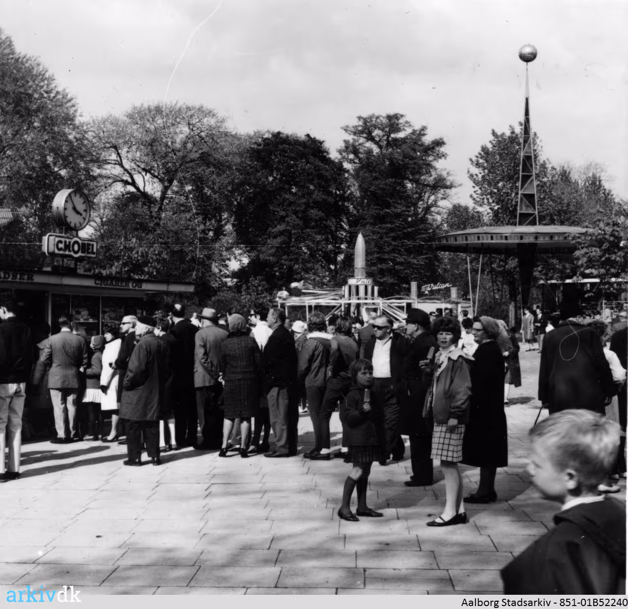 Beskrivelse Tivoli Karolinelund. Gæster står i kø foran en bod, i baggrunden anes karrusellen Vulcanen.