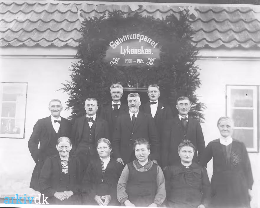 Karen Marie Jensdatter. Billedet er taget ved Jens Kristian Sørensens sølvbryllup 1926. Fra Sandbyvej? Forrest fra venstre: Anne Marie Jensen, Anna Sofie Nielsen, Ellen Christine Busk, Birte Frederikke Larsen, Johanne Boline Olsen. Bagest fra venstre: Lars Peter Sørensen, Carl Sørensen, Søren Peter Sørensen, Jens Kristian Sørensen, Niels Frederik Sørensen, Valdemar Sørensen. |